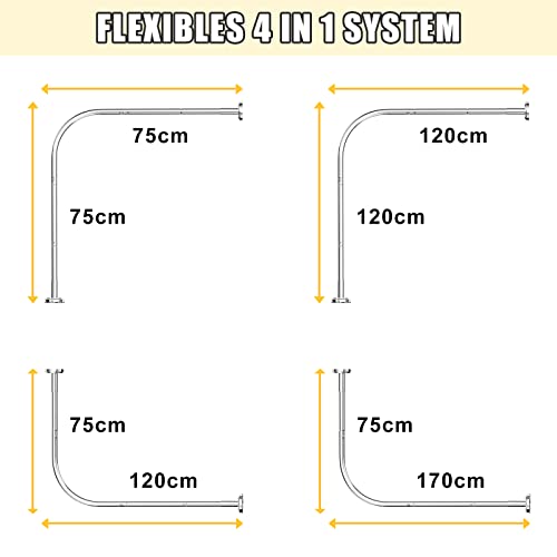 Sistema flessibile 4 in 1: le aste per tende da doccia possono essere combinate per formare aste angolari per tende da doccia da 75 x 75 cm, 120 x 120 cm, 75 x 120 cm, 75 x 170 cm. e può anche essere accorciato individualmente mediante taglio.