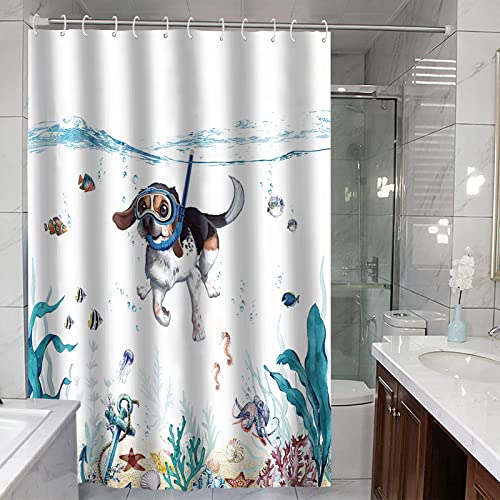 Design raffinato: la simpatica tenda da doccia per cani è realizzata in tessuto di poliestere di alta qualità e il motivo di stampa trasparente dà vita alla stampa della vita marina come il cane da sub e il pesce di mare, facendoti sentire come se fossi nel bellissimo oceano, comodo e rilassandoti allo stesso tempo, proteggi lo spazio privato per te e la tua famiglia.