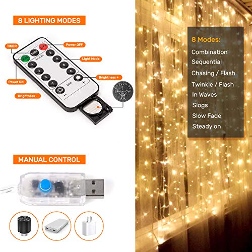 Luce bianca calda della tenda Le bellissime luci per tende sono la migliore illuminazione per camera da letto, camera delle ragazze, soggiorno, veranda, dormitorio, sfondo per tende, ecc. Le luci a LED creano un'atmosfera romantica per Natale, Capodanno, matrimonio, San Valentino, festival, compleanno, parte e vacanze.