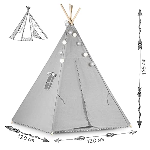 Tipi, tenda da gioco in cotone, per bambini, con 2 cuscini, 100% materiali naturali, ghirlanda di ricokids, tenda indiana in cotone e legno, per interni ed esterni, ragazzi e ragazze