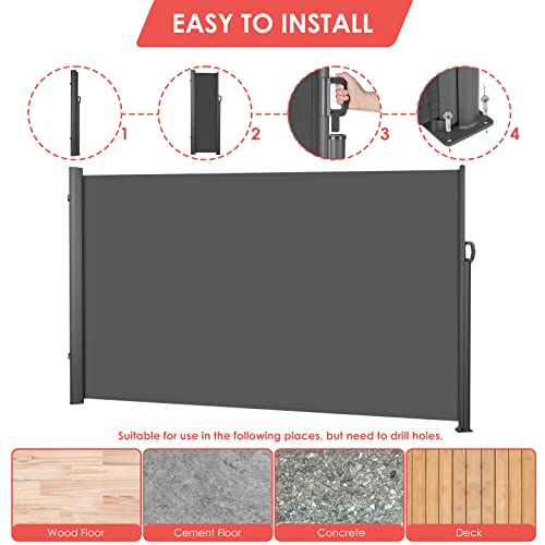 【Risparmiare Spazio】Ll telone della veranda laterale può essere facilmente aperto e chiuso tramite la maniglia, il design retrattile offre una buona flessibilità per un funzionamento regolare ea lungo termine e la molla retrattile è molto resistente. Quando non in uso, può essere retratto per un pratico e salvaspazio.