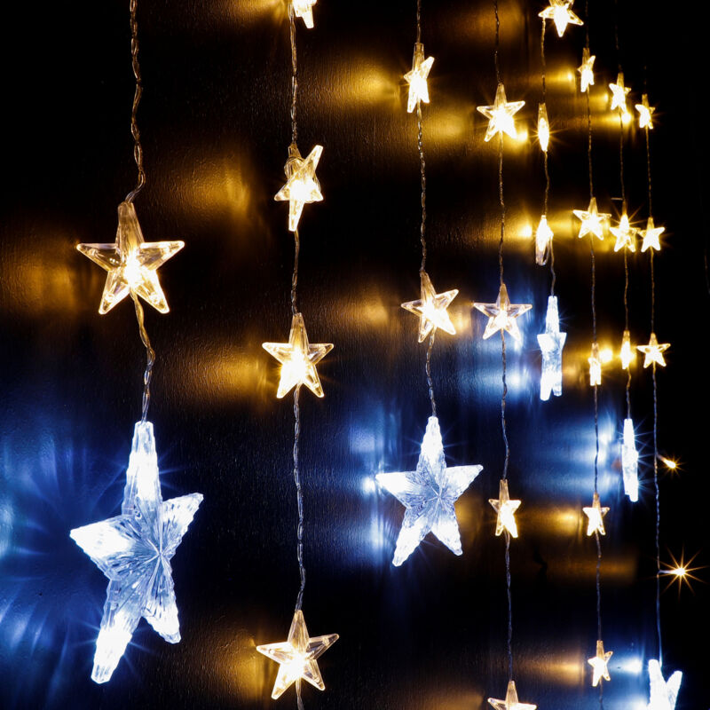 Tenda luminosa a stella a LED - 250 cm - con 138 LED bianchi caldi e freddi Tenda luminosa a stelle 250 cm con 6 stelle grandi, 6 medie e 46 piccole illuminate Dati articolo: La dimensione è di circa 250 cm x 120 cm x 3 cm (lunghezza x altezza x profondità) Materiale: plastica Colore: trasparente Emissione del colore: bianco caldo e bianco freddo Tenda luminosa con 6 stelle in circa 17 cm Ø / 6 stelle in circa 12 cm Ø / 46 stelle in circa 5 cm Ø 8 fili LED - distanza tra i fili circa 23 cm con 8 diverse funzioni di illuminazione con alimentatore IP44 - per uso interno ed esterno Lunghezza della linea di alimentazione circa 5 m un vero colpo d'occhio nella tua decorazione natalizia! Fornitura: 1 tenda luminosa a stella a LED