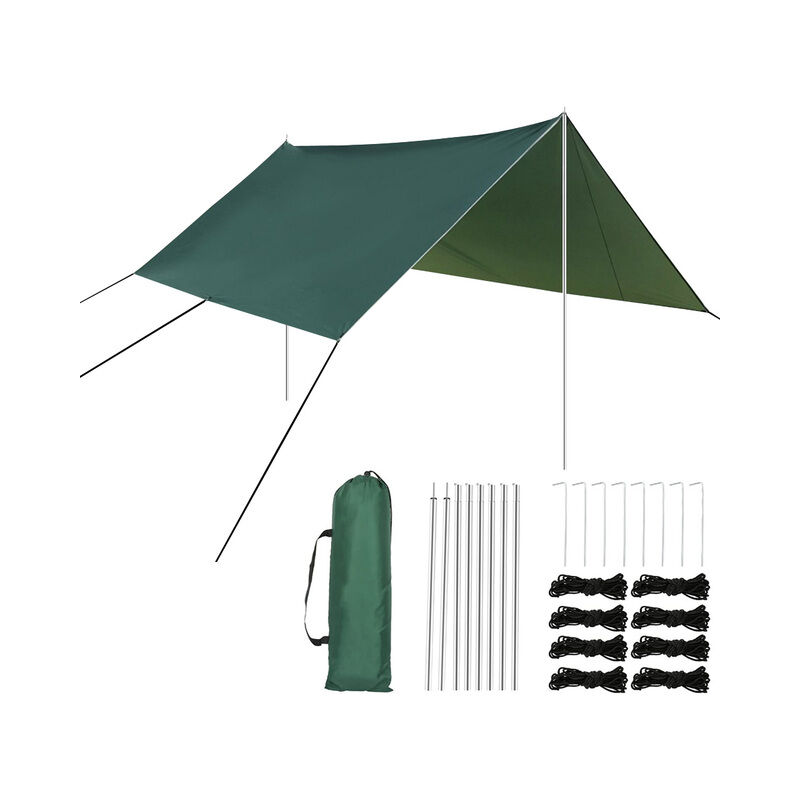 Elenco Delle parti:1 x Pioggia fly tenda tarp2 x Pali8 x picchi di Terra8 x funi di Vento1 x di OutsourcingEvidenziare descrizione:1. Impermeabile e anti-uv: Il telone di campeggio è fatta di 190T argento-rivestito di stoffa in poliestere, E lo strato interno è in argento-placcato, che ha un ottimo anti-ultravioletti, resistenza all'abrasione e resistenza all'acqua. E 'in grado di tenere lontano da sole, la pioggia, vento e neve per un lungo periodo di tempo.2. Facile da installare: La configurazione del prodotto può dare diversità in tutte le situazioni diverse. Si può anche essere utilizzato all'aperto con alberi, bastoncini da trekking e in posizione verticale bastoni.3. design perfetto: di Grandi dimensioni in grado di fornire abbastanza spazio per i vostri amaca o tenda. Le sue quattro angoli e due ali di utilizzare il doppio-strato di materiali e nylon rinforzato nastri, che garantire ulteriormente la durata del telo. La angolo di anello in acciaio inox con doppio passo di