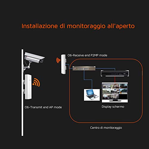 10 KM+ TRASMISSIONE: O6 è progettato specialmente per gli scenari di applicazione di un punto a lungo raggio all'aperto e munito di un amplificatore di potenza esterno e di un'antenna 16dBi per raggiungere un raggio di trasmissione dati wireless di 10 km +. Consigliato per l'acquisto a coppie.