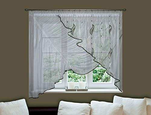DIMENSIONI: 150 cm, Altezza del pendio con fiori: 145 cm, Larghezza prima della piegatura: 350 cm, Adatto a bastoni per tende da 150 a 180 cm, Colore: Bianco Rifiniture: Marrone