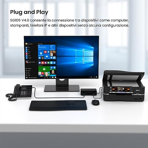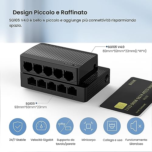 【Switch 5 Porte Gigabit】Full Gigabit 5 porte 10/100/1000 Mbps. Auto MDI/MDIX, conforme a IEEE 802.3/u/ab/x.