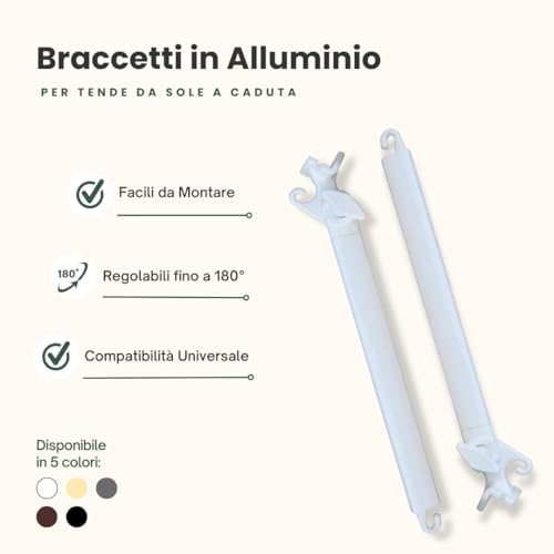 ✔️ [ ] I Braccetti per Tende da Sole esterne a caduta sono realizzati in alluminio. Lo snodo di regolazione e il gancio di fissaggio sono interamente in Alluminio presso-fuso, mentre il supporto centrale è in estrusione di Alluminio. Tale soluzione garantisce una maggiore presa e resistenza nel tempo.