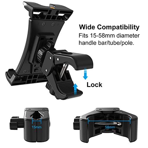 Rotazione a 360° con protezione completa: la connessione di regolazione consente di ruotare il supporto per tablet per cyclette di 360° per offrire il miglior angolo di visione per una migliore esperienza. Perfetto per seguire il canale sportivo sul tablet mentre ti alleni sul tapis roulant, o per visualizzare spartiti, testi e accordi mentre si utilizza come supporto per microfono. Struttura antiscivolo e resistente agli urti, mantiene il tablet/iPad sul manubrio della cyclette e sul supporto per microfono stabile e sicuro.