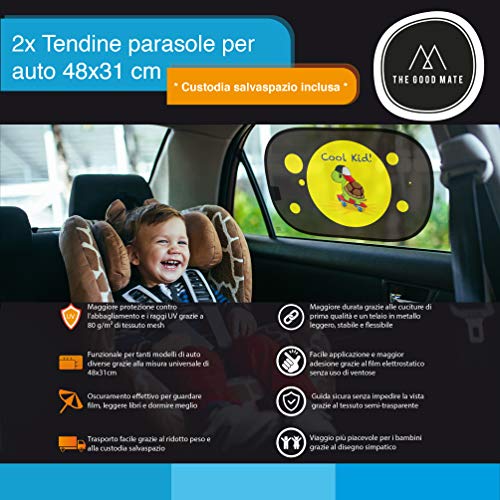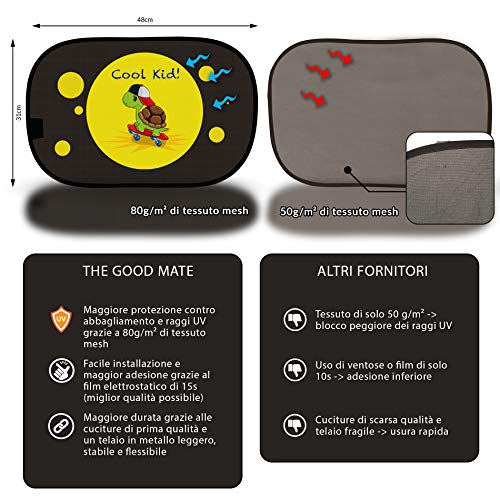 2 Tendine parasole auto bambini 48x31cm - Statiche adesive senza ventose - Ottima protezione raggi UV 80g/m² - Tendine auto bambini nere oscuranti con tartaruga - Coprisole auto bambini