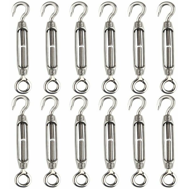 Tipo: gancio tenditore M4 OC (gancio e occhiello) Confezione: 12 pezzi gancio tenditore M4 Materiale: realizzato in acciaio inossidabile 304 di alta qualità, antiruggine e durevole., resistente all'acqua, alla ruggine e alla corrosione Applicazione: adatto per stringere la corda e regolare l'effetto elastico;