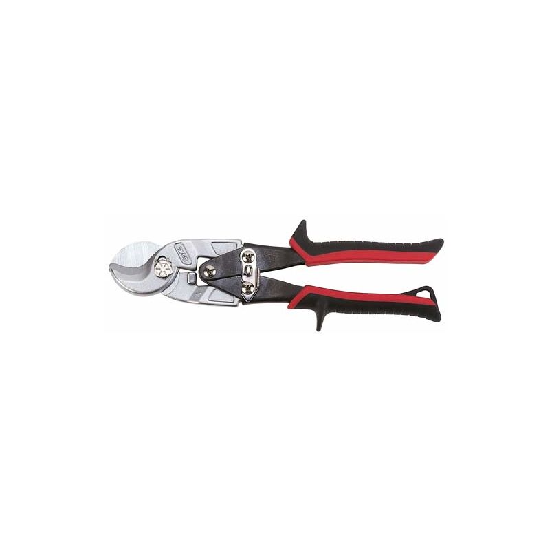 Tagliafili molto resistente. Battuto. Lame in acciaio legato al cromo molibdeno temprato per mantenere i taglienti in buone condizioni. La leva snodata aumenta la potenza di taglio riducendo lo sforzo. Il nuovo design, il funzionamento semplice e veloce senza chiusura automatica a molla (taglio con una sola mano) offrono sicurezza e praticità. Taglia cavi elettrici in rame e alluminio fino a N. 2 AWG (14 mm²) Diametro HRC 60-62