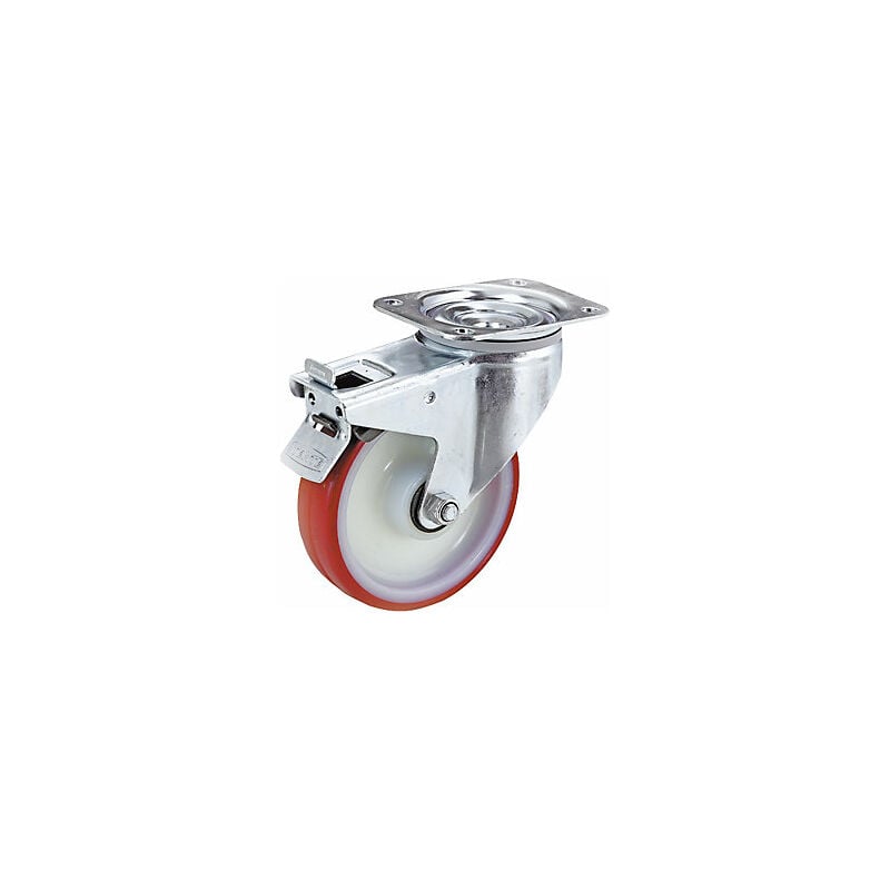Ruota in poliuretano e cerchione in poliammide, Ø x larghezza ruota 100 x 32 mm, rotella pivottante con fermo doppio. Fornitura = montato. Diametro ruote = 100 mm. Forma = rotella pivottante con fermo doppio. Materiale ruote = poliuretano (PU). Materiale cerchioni = poliammide. Materiale corpo = acciaio. Portata a 4 km/h = 150 kg. Tipo di fissaggio = con piastra di fissaggio. Larghezza ruote = 32 mm. Altezza d'ingombro = 128 mm. Cuscinetti ruota = cuscinetto a rulli. Resistenza alle temperature = da -40 °C fino a +80 °C. Sporgenza rotelle pivottanti = 41 mm. Diametro fori filettati = 9 mm. Lunghezza mozzo = 44.4 mm. Foro mozzo = 12 mm. Dimensioni piastra rotella a supporto fisso mm = 103x85 mm. Dimensioni piastra rotella pivottante = 105x85 mm. Interasse fori filettati = 60x77 - 80 mm. Superficie del corpo = zinco-cromata. Su cerchione in poliammide. Estremamente robuste, per alte prestazioni di scorrimento, ridotta resistenza al rotolamento. Resistenti alla maggior parte degli oli