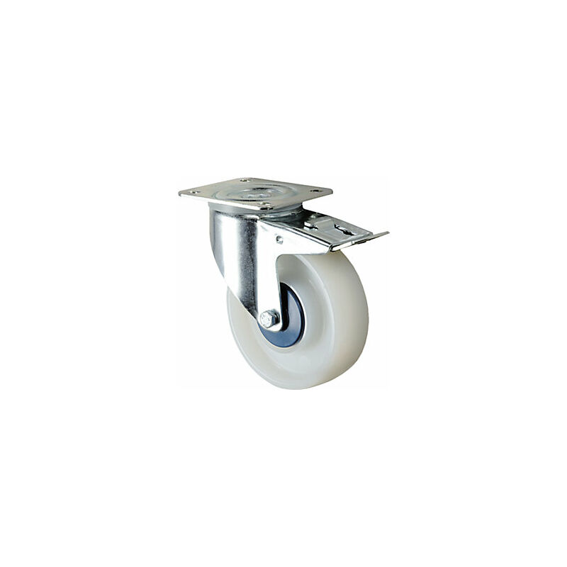 Ruota in poliammide, bianca, Ø x larghezza ruota 100 x 36 mm, rotella pivottante con fermo doppio. Fornitura = montato. Diametro ruote = 100 mm. Forma = rotella pivottante con fermo doppio. Materiale ruote = plastica - poliammide. Materiale cerchioni = poliammide. Materiale corpo = acciaio. Portata a 4 km/h = 250 kg. Tipo di fissaggio = con piastra di fissaggio. Larghezza ruote = 36 mm. Altezza d'ingombro = 128 mm. Cuscinetti ruota = cuscinetto a sfera di precisione. Resistenza alle temperature = da -40 °C fino a +80 °C. Sporgenza rotelle pivottanti = 41 mm. Diametro fori filettati = 9 mm. Lunghezza mozzo = 45 mm. Foro mozzo = 8 mm. Dimensioni piastra rotella a supporto fisso mm = 105x85 mm. Dimensioni piastra rotella pivottante = 105x85 mm. Interasse fori filettati = 80 / 77x60 mm. Superficie del corpo = zinco-cromata. 10 dB di rumore in meno rispetto a ruote comuni equivalenti. Riduzione del livello di rumore del dispositivo di trasporto. Unità di ammortizzazione all'interno del