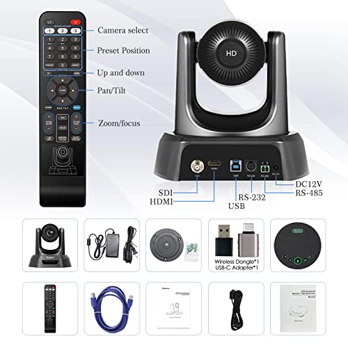 Tenveo 20X SDI PTZ Camera con 360° Microfono Conferenza Bluetooth per Conferenze,con Dongle e Adattatore Wireless,1080p HD Zoom ottico 20x Uscita Video USB-HDMI-SDI Webcam (20X+Bluetooth Mico)