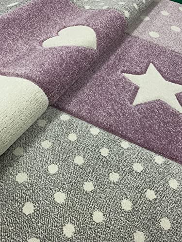Mia's Teppiche Marie - Tappeto per bambini, Tappeto per bambini, Bambino e bambina, Pastello, Moderno, Plaid, Puntini, Cuori, Stelle, Colore: Viola, Dimensione:80x150 cm