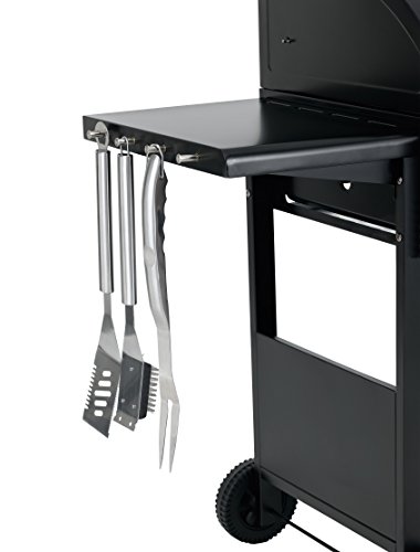 Pratici ganci per posate e 2 ripiani laterali offrono spazio aggiuntivo per utensili da barbecue, salse o spezie e maggiore comfort durante la grigliata.