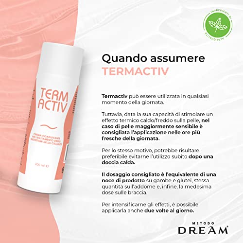 AZIONE INTENSIVA SU CELLULITE GAMBE E GLUTEI: Applicala una volta al giorno su gambe e glutei, preferibilmente la mattina. Nel caso l'inestetismo risulti molto evidente potrai effettuare un'altra applicazione la sera. Termactiv può essere utilizzata tutto l'anno senza interruzione.