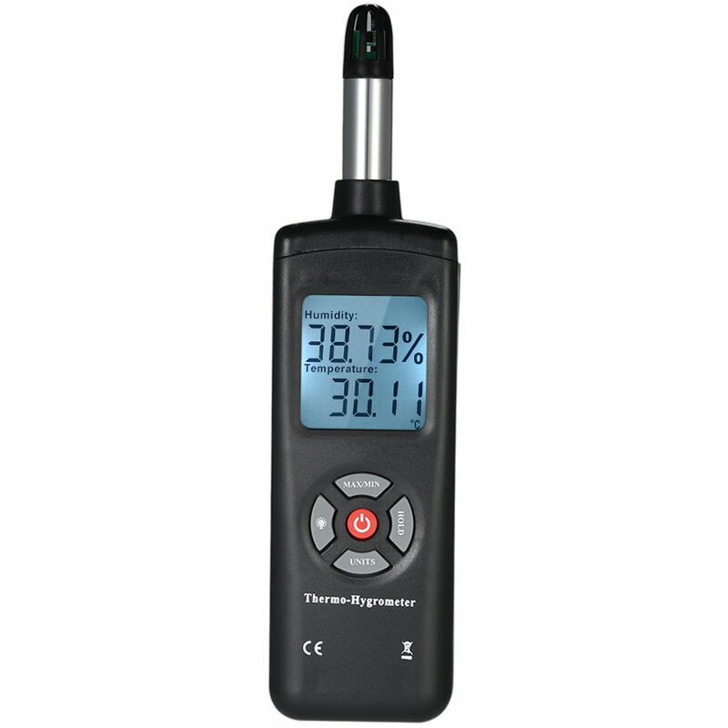 ed esclusivamente per misurare l'umidità, la temperatura dell'aria, la temperatura del bulbo umido e la temperatura del punto di rugiada. Caratteristiche: Misurare la temperatura e l'umidità, l'umidità del bulbo e la temperatura del punto di rugiada Ampio display LCD con retroilluminazione, facile e chiaro per la lettura.Alta precisione e tempo di risposta veloce.Minimo massimo. funzioni di archiviazione dati e dati. Spegnimento automatico e modalità sleep. Caratteristiche: Colore: nero/rosso (opzionale) Materiale: ABS< br/> Intervallo di umidità: 0~100% RH Risoluzione umidità: 0,01% RH Precisione umidità: ±2% RH (a 25°C / 20°F, dal 20% all'80% RH);