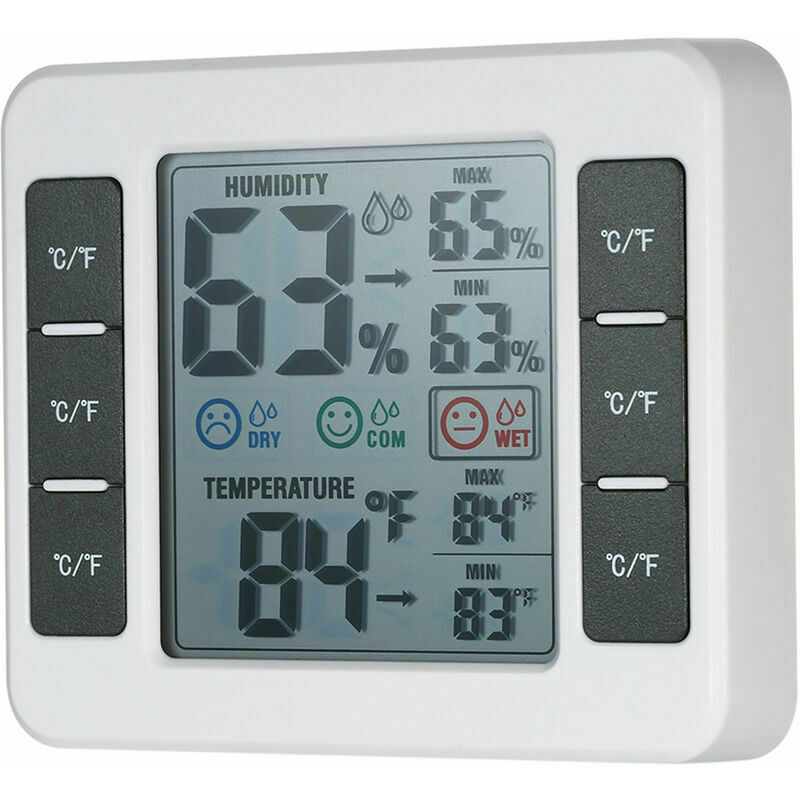 Mini termometro + igrometro con ampio display LCD, un ottimo dispositivo per visualizzare contemporaneamente temperatura, umidità e ora. Perfetto per la cameretta dei bambini, la stanza della chitarra, la camera da letto, la tenda da campeggio, ecc. È adatto a fornirti una condizione digitale e una vita migliore per mantenerti in salute. Caratteristiche: Termometro 2 in 1 + igrometro, un perfetto l'elettrodomestico aiuta a mantenere ottimali le condizioni di vita della tua famiglia. L'ampio schermo LCD visualizza la temperatura e l'umidità in tempo reale con la visualizzazione dell'andamento della temperatura e dell'umidità. Ampio intervallo di temperatura (0~50 ℃ / 32~122℉) e intervallo di umidità (20~95% RH). < p>Registra la temperatura e l'umidità interne max/min con unità di temperatura ℃/℉ per la selezione. 3 tipi di indicazione Livello di comfort: asciutto/confortevole/umido consente alle persone di conoscere più facilmente le condizioni dell'aria. Con il supporto pieghevole e