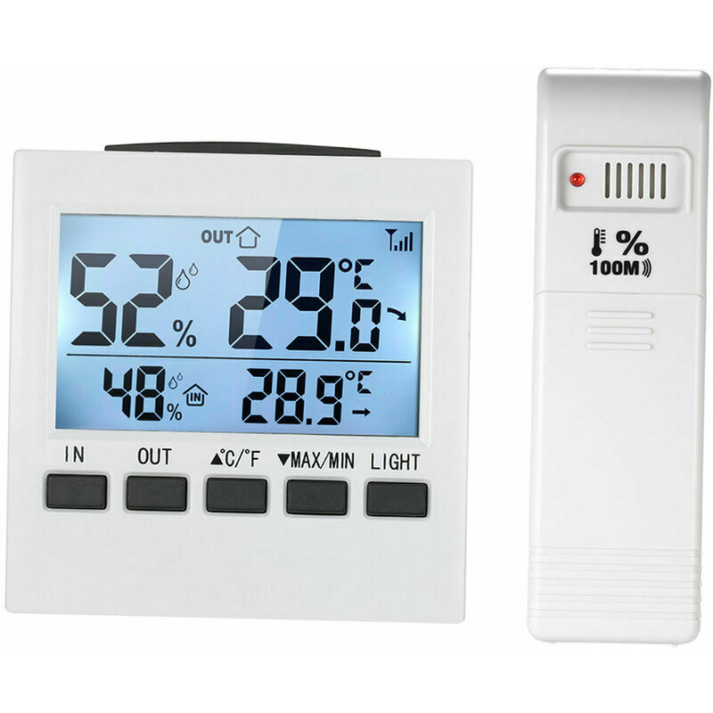 Questo mini igrometro digitale per la temperatura in grado di visualizzare contemporaneamente la temperatura e l'umidità interne ed esterne, è ideale per l'uso domestico, verdure in serra, magazzino e fattoria. Ampio display LCD con retroilluminazione, puoi leggere facilmente il valore. Il misuratore preciso per misurare la temperatura e l'umidità interne ed esterne. Caratteristiche: Visualizzazione della temperatura e dell'umidità interna ed esterna con unità di temperatura ℃/℉ per la selezione. Adottando la tecnologia wireless, puoi conoscere la temperatura esterna e l'umidità nel ricevitore all'interno. Registra la temperatura e l'umidità massima/minima interna ed esterna. Funzione di impostazione dell'allarme separata dei limiti superiore e inferiore della temperatura e dell'umidità interne ed esterne. Può essere posizionato sul tavolo con un supporto per un utilizzo facile e conveniente. Con trasmettitore portatile per indurre temperatura e umidità esterna e trasmissione a 100 m