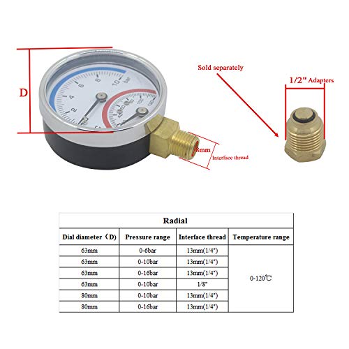 Termomanometro caldaia 63mm 80mm manometro temperatura pressione filettura radiale 0~6 0~10 0~16 bar 1/4 1/8 pollice (80mm 0-10bar 1/4")