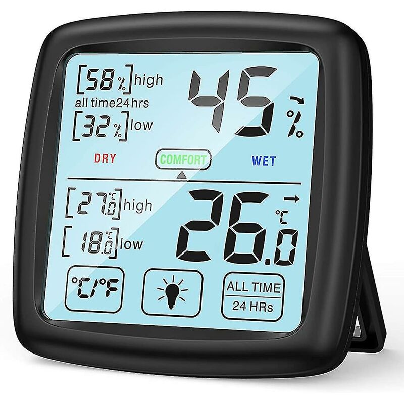 Ampia gamma di misurazione e alta precisione La gamma di misurazione della temperatura va da -10 a 60 C (da 14 a 140 F) e la precisione è 0,3 C (0,6 F). L'intervallo di misurazione dell'umidità è compreso tra il 10% e il 99% e la precisione è del 3%.L'igrometro, utilizzato come sensore di alta qualità, viene aggiornato ogni 10 secondi e fornisce il monitoraggio dell'umidità.elevata precisione.Grande display LCD con retroilluminazione Con un ampio display LCD, display nitido e schermo privo di sfarfallio, il termometro ambientale può essere letto facilmente da qualsiasi angolazione. Con la funzione touch screen, puoi lavorare direttamente sullo schermo in modo più diretto e conveniente. E con la retroilluminazione, puoi leggere facilmente di notte senza accendere la luce Monitoraggio dell'umidità con display comfort Il nostro igrometro per interni fornisce letture di temperatura/umidità in tempo reale e registrazioni di massimo/minimo. Con un display del comfort a tre stadi