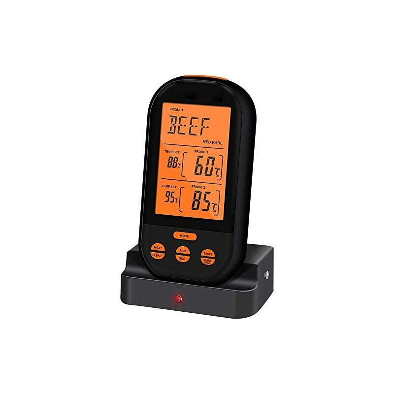 Il termometro per barbecue wireless a doppia sonda può essere utilizzato in forni, griglie da picnic e fornelli per barbecue da cucina. Questa sonda è completamente aggiornata per la resistenza al calore. Otto tipi di barbecue sono disponibili i pulsanti carne e cinque sapori. Quando la carne raggiunge una temperatura preimpostata, il cicalino emette un segnale acustico. Il termometro per barbecue è semplice da usare e facile da pulire