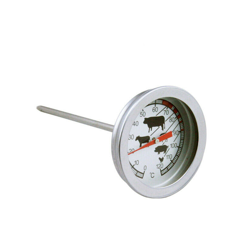 Termometro per carne analogico con scala rotonda (diametro: 5,5 cm) per misurare e controllare lo stato di cottura degli arrosti, adatto a diversi tipi di carne, misurabile sia in teglia che in forno. Scala temperatura da 0 a +120°C per la punto di cottura desiderato di carne, pesce o verdure, simboli di animali (mucca, maiale, pollo, vitello e agnello) per la corretta temperatura interna di diversi tipi di carne, nessun appannamento della scala, facile da leggere Nessun sanguinamento o danneggiamento delle fibre della carne grazie ad un ago corto e affilato, resistente al calore fino a 200 gradi, adatto al forno Facile da pulire a mano, non lavabile in lavastoviglie
