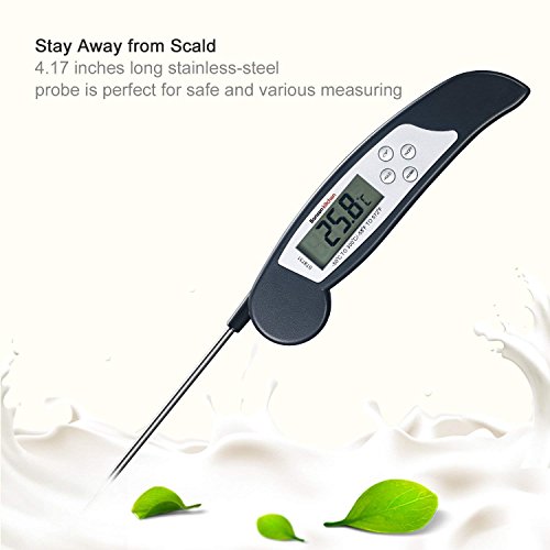 STARE LONTANO DA SCALD. 4.17 pollici La sonda pieghevole (angolo di regolazione 180 °) è perfetta per varie cotture interne ed esterne, come bistecche, manzo, agnello, maiale, pollo, tacchino, pesce e bevande liquide come caffè, tè, latte, acqua bollente, ecc. (Ma per favore non usare MAI il termometro in un forno chiuso!)