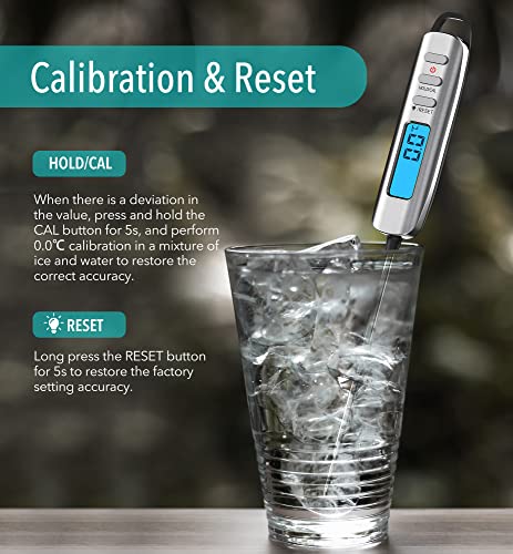 FACILE DA USARE E BLOCCARE LE LETTURE - Basta inserire rapidamente la sonda in acciaio inossidabile lunga 120mm in qualsiasi cosa tu stia valutando e otterrai una lettura in pochi secondi. Facendo clic sul pulsante "HOLD/CAL" si bloccherà la temperatura, dandoti il tempo sufficiente per vedere chiaramente il risultato.