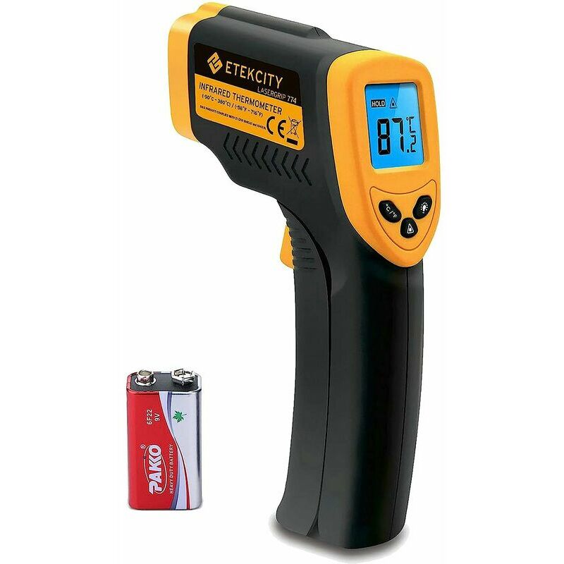 Descrizione del prodotto Pratico per uso interno ed esterno, il termometro a infrarossi 1080 consente di misurare in sicurezza le temperature superficiali a distanza mantenendo una precisione estremamente precisa. Misura temperature estreme tra -50°C (-58°F) e 380°C (716°F) senza dover entrare in contatto. Utilizza lo scanner di temperatura a infrarossi per un'ampia gamma di applicazioni, dall'elettronica interna alle temperature del forno. Con un funzionamento intuitivo e un intervallo di misurazione della temperatura oltre i punti di ebollizione, le possibilità sono infinite. NOTA La misurazione è più accurata quando la distanza tra il termometro e la superficie misurata è di 36 cm. Ciò consente al termometro di misurare la temperatura media su una superficie avente un diametro di 3 cm. Questo dispositivo non è destinato a rilevare la temperatura corporea. Contenuto della confezione< br/>1x Termometro a infrarossi Etekcity 774 1x batteria 9V 1x manuale utente (in francese)