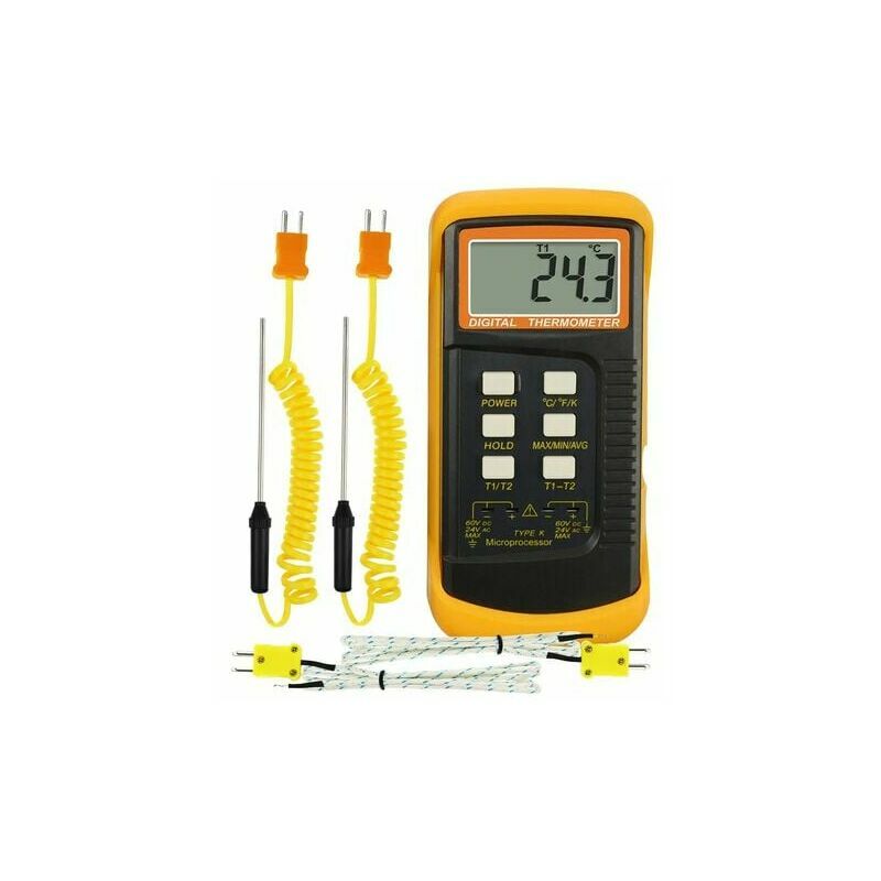 1. Caratteristiche del prodotto: Ampio intervallo di misurazione: -200,0 ℃ ~ 1370,0 ℃, -328,0 ℉ ~ 2498,0 ℉ Controllo software a chip singolo, accurato e affidabile, nessuna deriva È possibile selezionare unità di temperatura come ℃/℉/K Con funzione di blocco del valore di lettura Auto offset/Max/Min/Avg Frequenza di campionamento rapida, compensazione automatica della temperatura Indicatore di batteria scarica e funzione di spegnimento automatico Cavalletto posteriore monoblocco con copertura antiurto Doppio ingresso T1 e T2: lettura della differenza di temperatura di T1-T2 2. Parametri tecnici: Display: 5 è il display LCD digitale, il display massimo è 88888. Campo di misura: -200,0℃~1370,0℃ -328,0℉~2498,0℉ Risoluzione: 0,1℃/0,1℉ Precisione: 0,1% ± 0,4° (escluso errore sonda ) Ambiente di stoccaggio: -10 ~ 50℃ (-14 ~ 122℉), umidità