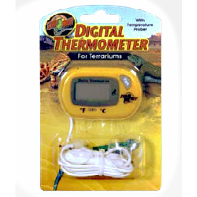 Termometro elettrico digitale con sonda per terrari Marca: Zoo Med Termometro elettronico digitale di precisione con sonda. Misura in °C e °F. Ideale per terrari, acquari o incubatrici per rettili. Gamma di temperature da -23°C a 60°C. Sonda termica lunga 99 cm garantisce la massima precisione. Altre caratteristiche: accessori per terrari rettili/anfibi termometro digitale sonda misura °C e F