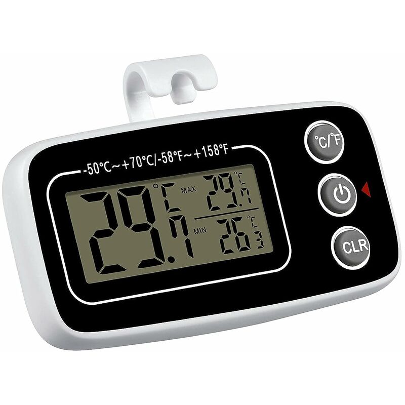 Ampia gamma e alta precisione - L'intervallo di temperatura è -50 -70 ℃ / -58 ℉ -158 ℉, con elevata precisione (+/- 1 (+/- 1,8). Adatto a frigoriferi, congelatori o ristoranti, bar, un normale termometro da camera utilizzato a casa e in altre occasioni. 【Funzionamento semplice e intelligente】 Ci sono 3 pulsanti, facili da usare. Basta premere il pulsante di accensione per accendere/spegnere il termometro. Premere il tasto °C/°F per selezionare Celsius/Fahrenheit. Utilizzando il tasto CLR, è possibile cancellare i valori di memoria della temperatura massima e minima. 【Ampio display LCD】 La temperatura in tempo reale può essere visualizzata a colpo d'occhio da molti grandi numeri sullo schermo LCD da 1,9 pollici. I record di dati minimi e massimi possono essere letti contemporaneamente. La struttura impermeabile IPX3 può resistere all'umidità del frigorifero o del congelatore, garantendo condizioni di lavoro sicure. 【Opzioni di posizionamento portatile】 -È possibile posizionare il