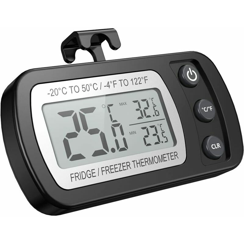 Ampio schermo LCD e funzione impermeabile - -Puoi leggere i risultati della misurazione a colpo d'occhio grazie all'ampio schermo LCD di facile lettura. È un buon aiuto per le persone che non hanno la vista migliore. La struttura impermeabile IPX3 può resistere all'umidità del frigorifero o del congelatore, assicurati che funzioni in modo sicuro e coerente. [Salva la temperatura più bassa e più alta] - Fornisci letture storiche della temperatura. Con questa funzione è possibile monitorare facilmente le variazioni di temperatura nel frigorifero e proteggere la sicurezza alimentare in due modi. [Funzionamento semplice e intelligente] - Sono necessari 3 pulsanti per utilizzare facilmente il termometro. Basta premere il pulsante On/Off per accendere/spegnere il termometro. Premere il pulsante ° C / ° F per selezionare Celsius / Fahrenheit. Premere il pulsante CLR per rimuovere i record massimo/minimo. Riavviare il termometro e la registrazione massima/minima verrà azzerata. [2 metodi di