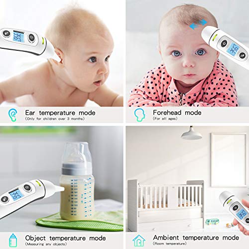 【Molteplici Modalità di Misurazione】Termometro fronte (adatto a tutte le età) e termometro orecchie (solo per il bambino sopra i 3 mesi). Voi anche in grado di misurare la temperatura degli oggetti (latte per bambini, cibo, acqua da bagno) e la temperatura ambiente.