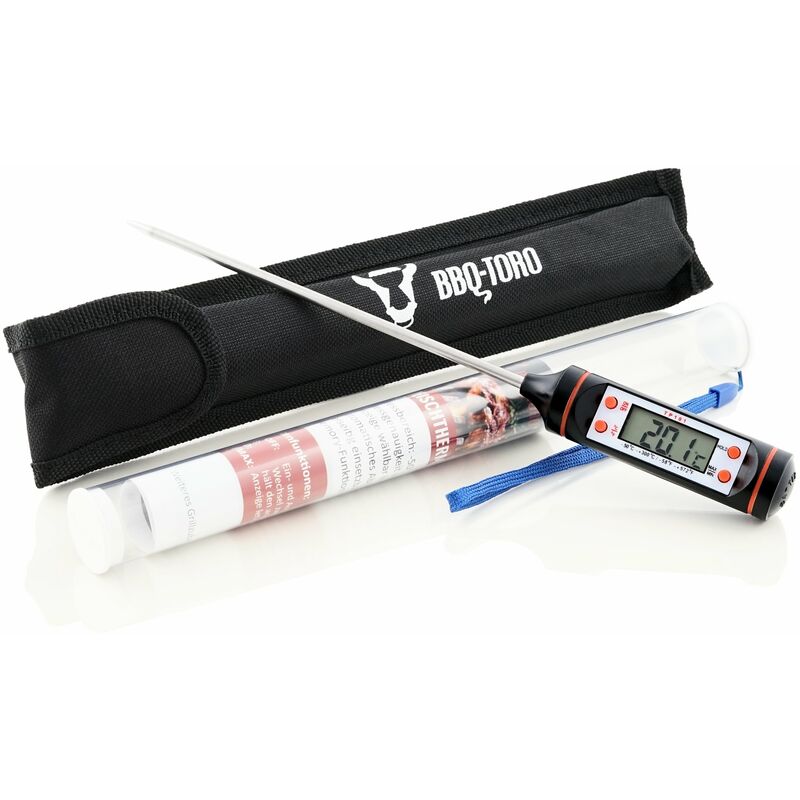 BBQ-Toro Termometro da griglia per bistecca, carne | termometro digitale per arrosti -40 °C a 300 °C Il termometro per carne è in grado di misurare la temperatura corrente sia in gradi Celsius sia in gradi Fahrenheit in tempi brevissimi. Ha un ampio intervallo di misurazione che va da -50 °C a +300 °C (da -58 °F a +572 °F) con una precisione di misurazione di +/- 1 °C. Il termometro non è solo un compagno perfetto in cucina, ma anche un accessorio ideale per il vostro barbecue. Riscalda i cibi grigliati a una temperatura sana, gustosa e sicura. La funzione di autospegnimento integrata spegne automaticamente il termometro per barbecue dopo 10 minuti per risparmiare la batteria. Dopo l'uso, è facile da pulire e può essere riposto in modo pulito e sicuro nel tubo di plastica in dotazione. L'impugnatura lunga protegge le mani dalle bruciature durante la misurazione. La punta sottile della sonda evita fori enormi, in modo che quasi nessun succo possa fuoriuscire e la carne