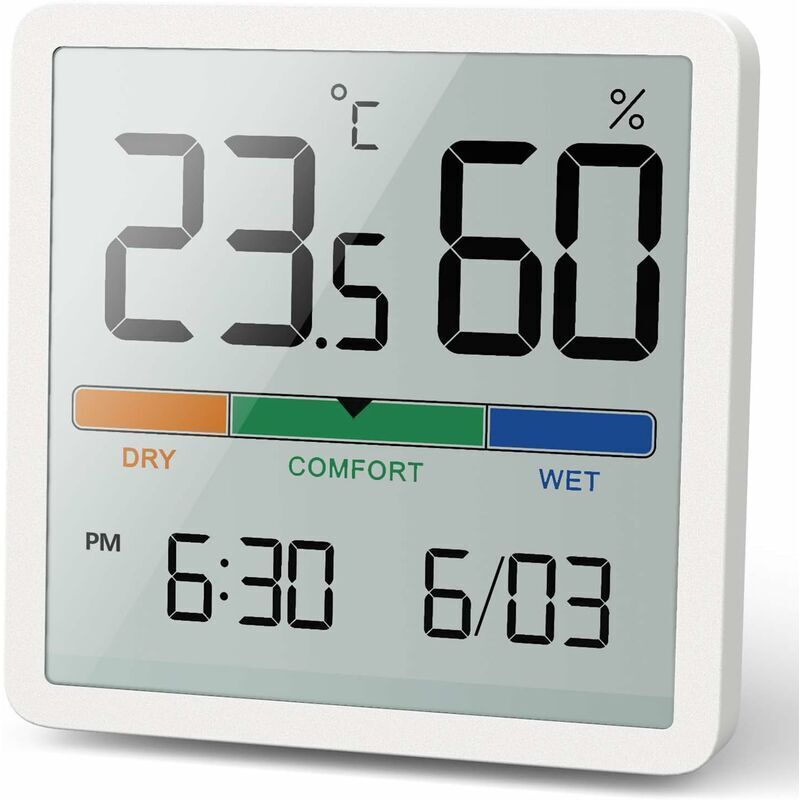 Schermo LCD da 3,34 pollici, la lettura è più chiara - Il termometro igrometro per interni con schermo LCD da 3,34 pollici Lo schermo ha una cornice pulita e sottile che è facile da leggere da tutte le angolazioni ea tutte le distanze. [indicatore luminoso della zona di comfort] Il simbolo indica condizioni asciutte, confortevoli e umide a seconda dell'umidità e della temperatura dell'aria interna. [Super portatile e 3 metodi di installazione] Esistono 3 opzioni di installazione per il termometro e l'igrometro digitale per interni, che possono essere utilizzati per desktop, parete e magnete. Appeso in modo flessibile, appeso al muro o installato nel suo insieme, solo all'interno, ma in luoghi ridondanti, scantinati o garage [Risposta rapida e alta precisione] Velocità di risposta rapida, aggiornamento ogni 10 secondi, lettura accurata, ampio intervallo di misurazione, errore di temperatura: -9,9°C-60°C (14,2°F-140), accuratezza della temperatura: ±1° vs. Misurazione dell'umidità