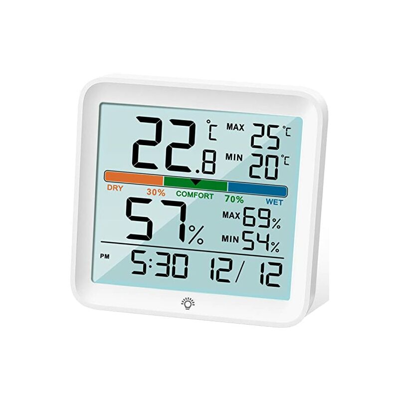 Grande schermo LCD e retroilluminazione - Dimensioni 3,6 * 3,4 * 0,94 pollici, termometro igrometro aggiornato con schermo LCD da 3,7 pollici, più facile da leggere da qualsiasi angolazione e lunga distanza. Icone touch retroilluminate bianche per una lettura più facile in condizioni di oscurità e per l'illuminazione dello schermo (15 sec auto). 【Record max e min】Il termometro digitale visualizza i record di umidità e temperatura. temperatura massima e minima dell'ultimo 24 ore, permettendoti di prendere misure in anticipo, come un termostato o un umidificatore per regolare la temperatura. (Nota: tieni premuto il pulsante °F/°C per ripristinare i dati MAX e MIN.) 【Aggiornamento accurato e rapido】Il termometro per interni si aggiorna ogni 10 volte, offrendo la lettura più quadrata, integrata sensore sensibile. Intervallo di temperatura -9,9 ~ 60°C, precisione ±1;