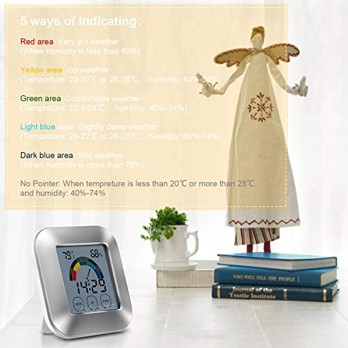 ▲ Termometro e igrometro indispensabili per la vostra famiglia. Multifunzione, tra cui visualizzazione della temperatura interna, monitoraggio dell'umidità, impostazione dell'ora e dell'allarme, e indicazione del comfort dell'umidità.