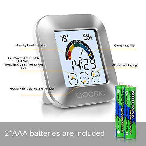 Termometro igrometro, igrometro interno, igrometro digitale adorico, misurazione della temperatura interna, misuratore di umidità dell'aria, monitor dell'aria, monitoraggio dell'aria, con orologio e timer e schermo touch intelligente.