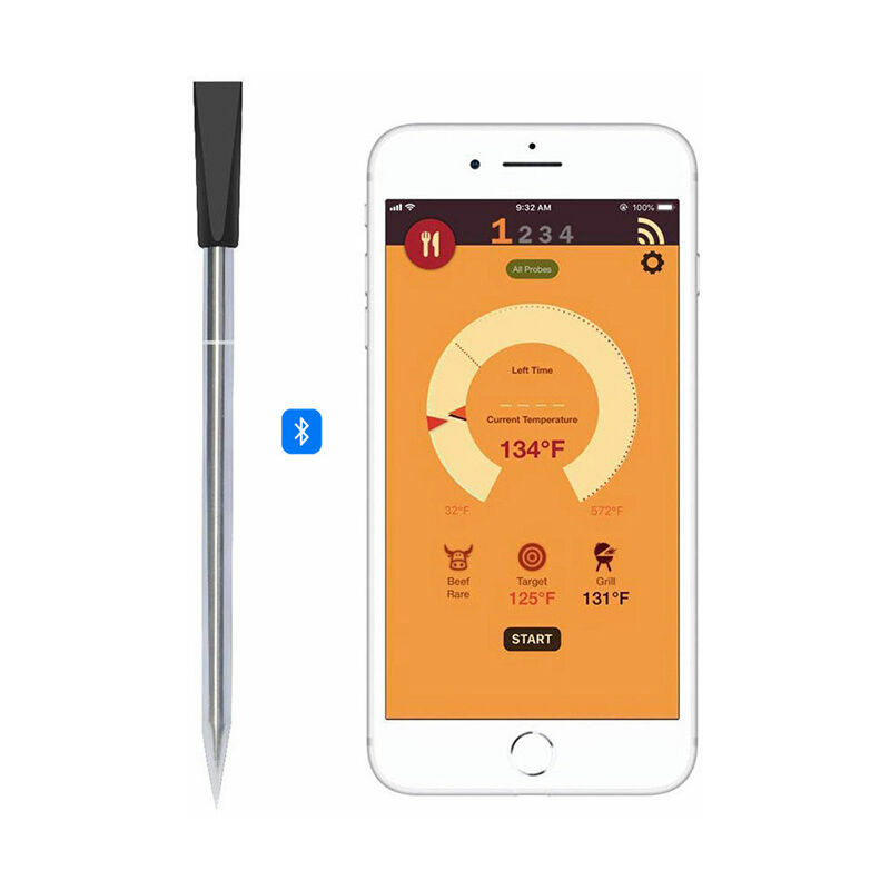 Sonda per grill wireless Bluetooth Utilizzando una microelettronica esclusiva e una tecnologia di produzione di precisione, i dati di misurazione della temperatura della sonda in acciaio inossidabile vengono trasmessi in modalità wireless allo smartphone, eliminando il cavo di collegamento spesso e lungo per le alte temperature del tradizionale termometro per barbecue, molto comodo per gli utenti. . È possibile monitorare la crudità e la cottura del cibo in qualsiasi momento sul cellulare e quando il cibo grigliato raggiunge il valore di temperatura predeterminato, si accenderà automaticamente. Particolarmente adatto per forni e grill elettrici chiusi, sostituirà i tradizionali termometri barbecue. Caratteristiche: ①Struttura tubolare in acciaio inox, in grado di rilevare contemporaneamente la temperatura del cibo e quella del forno ②Tre modalità di cottura: ricetta/timer/target temperatura ③L'app può impostare 9 tipi di cibo e 4 livelli di crudezza ④ Quattro sonde grill Bluetooth