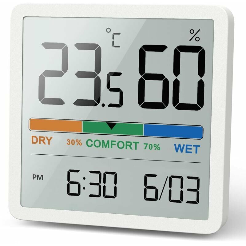 Ampio schermo LCD da 3,34 pollici e lettura più chiara] - Termometro igrometro per interni con schermo LCD da 3,34 pollici - Cornice elegante e sottile, facile da leggere da qualsiasi angolazione e a distanza. Indicatore della zona comfort I simboli ] indicano le condizioni ASCIUTTO, COMFORT e UMIDO a seconda dell'umidità dell'aria e della temperatura interna. Questo ti aiuta a sentirti a tuo agio avendo il tempo di regolare il termostato e le impostazioni dell'umidificatore o del deumidificatore. Super portatile 3 metodi di montaggio ] Termometro digitale per interni Noklead con 3 opzioni di montaggio per tavolo, parete e montaggio magnetico. Flessibile da appendere, appendere al muro o in piedi, solo all'interno della casa, ideale per la sorveglianza in cantina o in garage. Risposta rapida e alta precisione] Con risposta rapida aggiornata ogni 10 secondi e valori di misurazione accurati, ampio intervallo di misurazione che misura la temperatura: -9,9 ° C - 60 ° C (14,2 ° F - 140 °