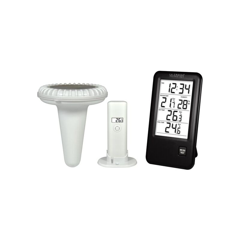 Funzione tempo radiocontrollata DCF-77 l'ora può essere impostata manualmente Il segnale DCF può essere disattivato visualizzazione della temperatura in ° C o ° F Visualizzazione della temperatura e dell'umidità interna temperatura esterna wireless tramite il trasmettitore esterno temperatura dell'acqua senza fili tramite il sensore della piscina (profondità di misurazione 100 mm) valori max/min punto di rugiada indicatore di stato della batteria supporto da tavolo e montaggio a parete sensore sostitutivo/sensore aggiuntivo: [product name=WSTR25]WSTR25[/product] Caratteristiche fisiche Numero di batterie del trasmettitore: 2 Sensore di colore: Bianco Colore trasmettitore: Bianco Trasmettitore di profondità: 19 mm Diametro del sensore della piscina: 110 mm Altezza sensore piscina: 134 mm Altezza del trasmettitore: 128 mm Larghezza del trasmettitore: 41 mm Numero di batterie sensore piscina: 2 Numero di batterie del ricevitore: 2 Funzioni Risparmio di luce diurna: Sì Caratteristiche