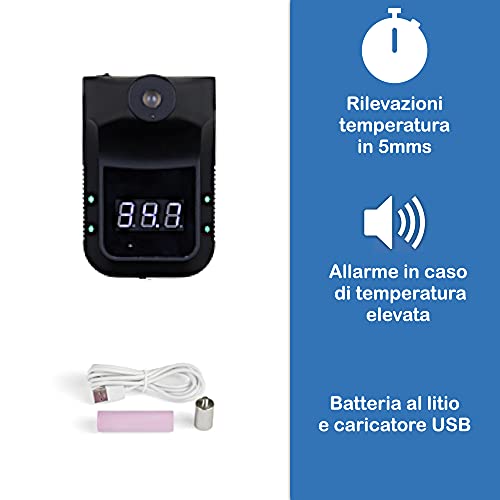 INCLUDE - La spedizione include una piantana regolabile a 3 diverse altezze, un termometro frontale automatico per la misurazione della temperatura, batteria al litio e cavo USB