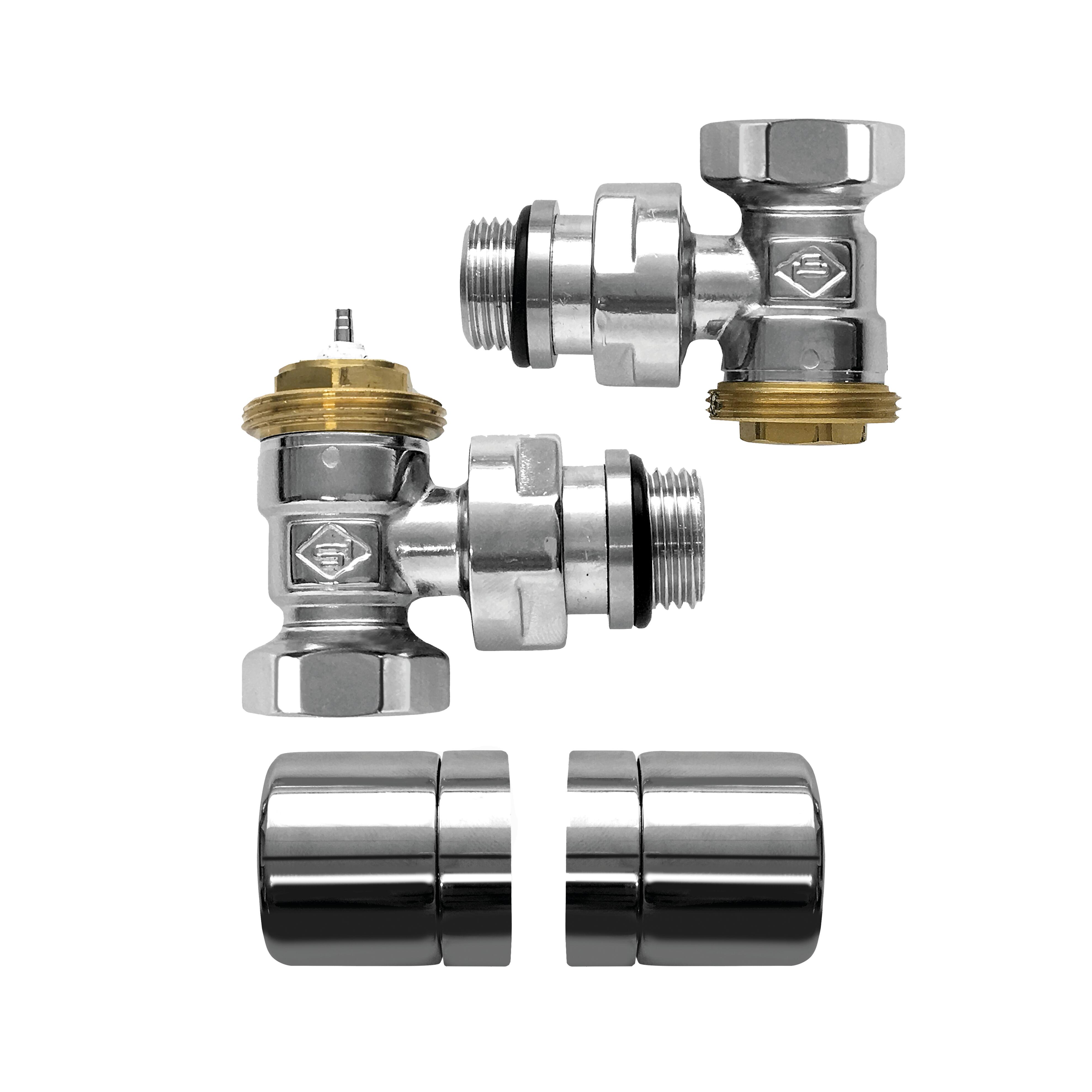 In ottone cromato, volantino in plastica cromato, kit composto da valvola, detentore. Indicata per tubo rame, tubo multistrato, con attacco 24/19