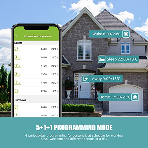 【Risparmio energetico e costi】 Con la modalità di programmazione 5 + 1 + 1 e 6 periodi / giorno, questo termostato caldaia può impostare programmi diversi per giorni lavorativi, fine settimana e diversi periodi della giornata, il che non solo consente di ottenere la temperatura a proprio piacimento ogni volta che casa, ma risparmia anche molta energia e costi di riscaldamento.