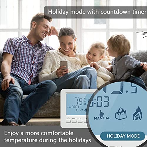 【Selezione del programma settimanale】 Supporta l'impostazione manuale del programma settimanale di 5+2, 6+1 e 7 giorni per opzione, offrendoti la massima comodità per diverse situazioni. Memorizzazione dei dati quando il dispositivo è spento. I giorni di vacanza e la temperatura possono essere impostati per funzionare in modalità conto alla rovescia e godere di una temperatura più confortevole in vacanza.