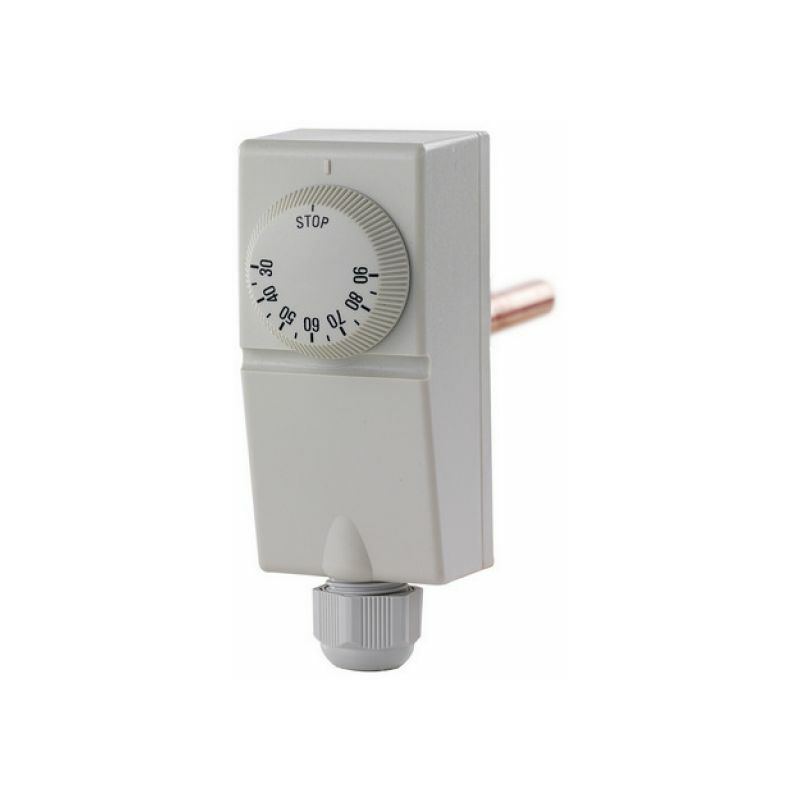 Termostato elettromeccanico in custodia plastica. Regolabile 30-90 °C, ad immersione, funzionamento ad espansione di liquido. Il termostato è impiegato soprattutto su impianti di riscaldamento per la regolazione pompe bruciatori, aerotermi e simili. (DianFlex)