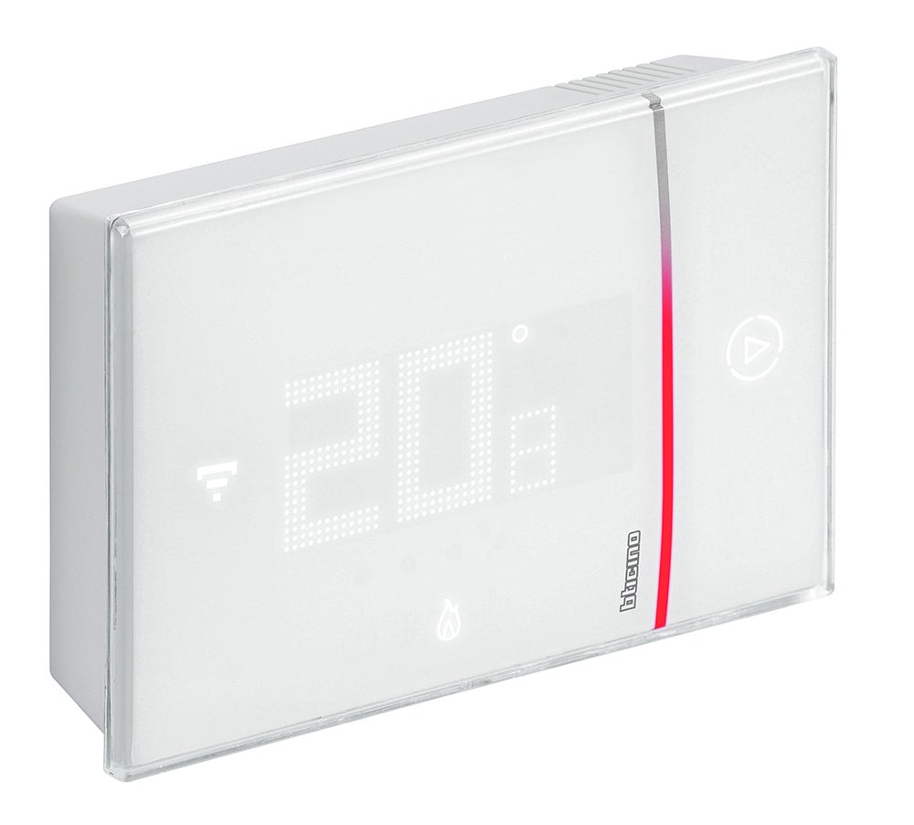 Termostato connesso Smarther2 with Netatmo. In abbinamento con la APP Home + Control permette di regolare e monitorare la temperatura all'interno degli ambienti in modo preciso e puntuale. Controllo della temperatura della casa. Controllo da remoto del cronotermostato. Localmente sono possibili l'impostazione del livello di temperatura per il funzionamento manuale e l'attivazione della modalità Boost, che permette di forzare l'accensione dell'impianto per un periodo limitato (30, 60 o 90 minuti) indipendentemente dalla temperatura misurata e da quella programmata.. È possibile anche impostare una temperatura differente in ogni stanza della casa per il massimo comfort, in quanto è compatibile con le valvole termostatiche intelligenti di Netatmo.. Il termostato connesso Smarther with Netatmo è comandabile tramite assistenti vocali Google, Amazon Alexa e Apple Home Kit.